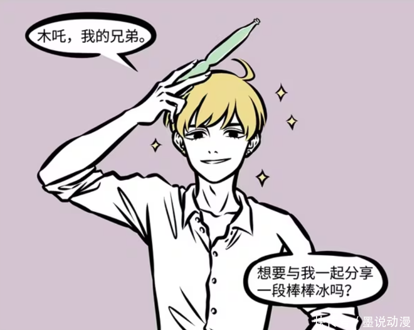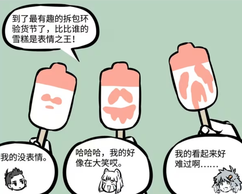 《非人哉》漫画版,夏天到来之后,主角们都喜欢吃雪糕和棒棒冰来解暑。九月请大家吃娃娃雪糕,看看谁开出的表情最特别。没想到敖烈开出特殊表情包,这种情况理论上不会出现。另外金吒请木吒吃棒棒冰,结果只是金吒戏耍木吒而已。